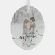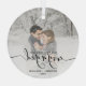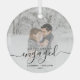 Commémorez votre fiançailles avec ce magnifique ornement de gardien moderne. Le texte noir indique "Notre premier Noël engagé", avec le mot "engagé" dans un élégant script d'écriture manuscrite avec des fioritures avant et après. Remplacez l'exemple d'image par votre photo préférée, et ajoutez vos noms et l'année. Un filtre dégradé blanc permet de faire apparaître le texte.
