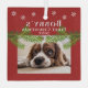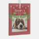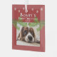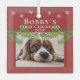 Puppy`s 1er Noël Pine Rouge Snowflakes Photo Glass Ornement. Arrière - plan rouge festif aux flocons blancs et branches de pin. Ajoutez le nom, l'année et la photo de votre chien.