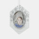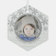 Concevez vos propres ornements en verre photo personnalisés, imprimés uniquement pour vous, et créez des cadeaux de Noël précieux pour votre famille et vos amis. Ce design chic de flocon de neige en fausse parties scintillant argent présente votre photo transformée en une image ronde encadrée d'un faux cadre argenté, posée sur un arrière - plan de faux bois blanc rustique pour une touche de charme de Noël de ferme. Ajoutez simplement votre photo à l'aide du modèle facile et regardez-la devenir une partie de cette conception de flocon d'argent. Personnalisez cet ornement en verre hexagone unique avec votre texte en bas dans une police gris argenté qui est équilibrée par les neuf minuscules flocons de neige en faux argent de parties scintillant qui dérivent sur le dessus de l'ornement. Les ornements personnalisés sont parfaits pour commémorer le premier Noël du bébé, le premier jour férié comme un couple marié ou comme une façon mignonne de montrer des photos d'animaux de compagnie ou de vacances familiales. Customisez ces flocons de neige en fausse parties scintillant argent unique avec vos photos et faites vos propres cadeaux personnalisés qui sont sûrs d'apporter des sourires.