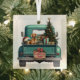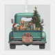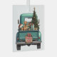 Un pick-up bleu turquoise porte un arbre de Noël décoré et des colis cadeaux sur ce joli ornement de Noël en verre. En regardant de la hayon arrière est un beau chien de Viszla rouge. Un panneau en bois rustique sur le pare-chocs arrière dit "Cheer de Noël".