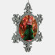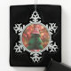 Une photo d'un ornement vert d'arbre de Noël qui est lumineux et coloré. C'est sur un ornement encadré de flocon de neige. Avec les lumières de Noël et l'arbre dans le fond.