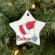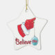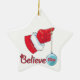 Cette conception lunatique en forme d'étoile a une main de Père Noël avec un ornement bleu balançant de l'extrémité d'une ficelle. Il y a texte personnalisable sur l'ornement bleu pour que vous ajoutiez l'année. Le texte coloré supplémentaire lit : "Croyez". Cette conception fait un grand cadeau pour des "croyants" de n'importe quel âge !