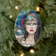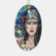 Un beau gitan d'une chevelure foncé avec les yeux verts jugeant une boule de cristal entourée par le feuille et un ciel de nuit.