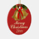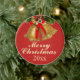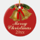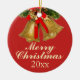 Deux cloches dorées ornées de sources de pin, de cônes de pin et de ruban rouge ornent cet ornement de Noël rouge. Joyeux Noël et l'année sont écrits ci-dessous. Vous pouvez modifier le 20xx pour lire n'importe quelle année que vous voulez. Vous pouvez également modifier la couleur ou le texte.