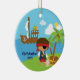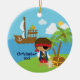 Notre ornement personnalisé et daté unique de Noël de pirate comporte le petit garçon de pirate le plus mignon réglé sur l'arrière - plan bleu de l'eau d'océan avec un bateau, un palmier et un coffre au trésor de pirate ! Personnalisez avec votre information et date et vous sont tous placent pour aller ! Cadeau daté merveilleux de souvenir pour votre arbre de Noël et une grande addition à vous collection d'ornement de Noël.
