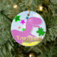 Ornement pourpre de dinosaure de bande dessinée avec le nom. Un petit Tyrannosaurus mignon Rex (T-Rex) de dinosaure de bande dessinée avec le paysage heureux, les arbres, les montagnes et le vulcano d'âge de pierre avec l'ornement coloré d'étoiles avec personnalisable votre nom là-dessus. Ce produit est entièrement personnalisable, ajoute vos textes et images ! Un grand ornement de dinosaures de T-Rex pour la grande petite fan de Dino !