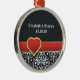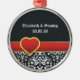 Masque noir blanc avec bande rouge & mariage de coeur Enregistrer la date ornement photo, avec un design élégant, élégant et romantique d'un motif floral noir et blanc ( B&W ) damassé, une bande rouge, un coeur bijou avec contour doré et une police de type vintage. Classique mais moderne à la fois. Grand comme un mariage ou un cadeau de la Saint-Valentin et pour d’autres occasions et anniversaires. Notez que le coeur est une illustration.