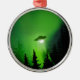 UFO planant au-dessus des arbres impeccables la nuit avec les lumières du nord vertes à l'arrière-plan.