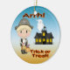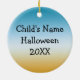 L'avant rond d'ornement de garçon de pirate de Halloween comporte un arrière - plan bleu, blanc et brun de gradient (personnalisable), un garçon mignon de bande dessinée dans un costume de pirate avec un citrouille de des bonbons ou un sort complètement de la sucrerie se dirigeant à une Chambre hantée avec un vol amical de fantôme ci-dessus. Le texte stylisé orange et noir est Arrh ! Des bonbons ou un sort. Le texte est installé sur de nouveau à ajoutent le nom et la date de votre enfant. Cadeau parfait de souvenir pour Halloween ! Pour customiser la couleur d'arrière - plan - supprimez le fond d'image - cliquez sur la "personnaliser bleue il" bouton, - cliquent sur dessus le "X" à côté du fond d'image, puis cliquent sur dessus "éditent" puis le "arrière - plan", choisissent votre couleur et cliquent sur dessus "fait".