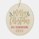 L'élégant ornement de Noël Joyeux présente des pièces d'écriture d'or antique et des accents de branches vertes avec des feuilles saints et des baies rouges. Personnalisez avec le nom personnalisé / la famille et le texte de l'année, et ajoutez une photo de famille préférée sur le côté opposé. La couleur arrière - plan beige neutre peut être modifiée.