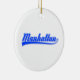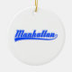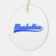 Manhattan, New York City, écrit avec un swash (queue). Polices en blanc et bleu. Conception de texte originale.