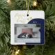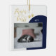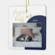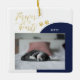 Rappelez-vous votre être cher avec cet ornement de Noël commémoratif. Ce design présente des lettres dorées modernes "À jamais dans nos cœurs" avec des blocs de couleur géométriques (Noir & Blanc). Vous pouvez ajouter votre photo et personnaliser le texte. Plus de cadeaux et de cartes de vacances sont disponibles dans ma boutique BaraBomDesign.