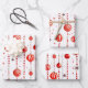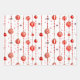Ce papier d'emballage présente un motif répétitif d'ornements de Noël rouges et blancs accrochés à des cordes verticales de perles rouges. De petites étoiles rouges stylisées parsèment l'arrière - plan blanc. Certains ornements sont en rouge massif, d'autres en rayures rouges et blanches.