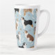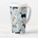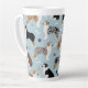 De mignons bergers australiens / chiens australiens en manteaux noirs, bruns et merles s'assoient et tiennent des os et des empreintes de pattes de chien éparpillés sur un arrière - plan bleu clair.