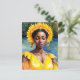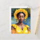 Carte postale : aquarelle de orisha à la peau brune, Osun - déesse de la divinité, la féminité, la fertilité, la beauté et l'amour. Elle porte une coiffure à fleurs, des bijoux à fleurs, et une élégante robe jaune doré avec un arrière - plan naturel avec un plan d'eau. Un portrait esthétique mélanine africain royalcore d'une beauté divine.