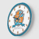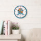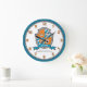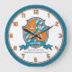 Knights style shield monogram letter O art name simple numbered wall clock perfect for a boys bedroom or playroom in shades of orange, blue white and gray. Personalize with your child's own name and name meaning for a personalized touch to your child's bedroom or nursery, this example is for names with the letter O. Currently reads Othni My time, my hour. Methodical, strong and clever. Ideal for a gift to a new baby boy, for a christening, baby naming or baby shower gift. Unique shield drawing, dog face, crown and graphic star art, name research, wording and design by Sarah Trett. www.sarahtrett.com for www.mylittleeden.com