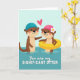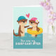 This card shows two cartoon otters floating in calm, two-tone aqua water under a pale aqua sky, sharing a sweet, friendly moment 🥰. The left otter wears a blue swim cap and leans in with a gentle paw extended, eyes turned toward its companion as if mid-hello. Across from it, the right otter wears a pink swim cap with a small white-and-yellow flower and relaxes in a bright yellow inner tube, smiling back with rosy cheeks ❤️. A pink heart hovers between them, just above their heads, tying their warm eye contact together. The illustration uses crisp outlines and soft shading so the characters pop against the simple water-and-sky background. Below the scene, the phrase “You are my SIGNIFICANT OTTER” sits centered near the bottom in pink lettering, easy to spot against the lighter background. The water shifts from lighter aqua near the top to a deeper blue below, framing the otters in the middle.