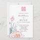 Cette faire-part de mariage fleurie présente une aquarelle représentant une fleur de lotus et un double symbole de bonheur dans un ton rose assorti sur un arrière - plan blanc. À l'envers, il y a un code qr scannable pour votre site mariage.