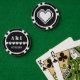 Give the guests, bridesmaids, groomsmen, or anyone else attending or helping with your geeky wedding or special event a fun treat with these customizable poker chips. One side of the poker chip features a white pixelated heart on a deep onyx black background. The other side has a sample set of initials and date separated by a pattern of retro video game related 8-bit hearts. The sample text can be customized with your own details or a special message of your choice to create a unique and personal token to commemorate your big day. This design will match any product from the Our 8-Bit Hearts in Black line so that you can make your gaming themed wedding or special event as coordinated as you like.