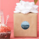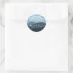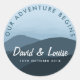 A wedding sticker featuring a blue mountain background. Across the top it says "our adventure begins" and along the bottom is space for the couple's names and the date of your wedding or a short message.