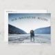 A rustic save the date photo postcard for the outdoorsy and adventurous couple, designed to accommodate your favourite horizontal or landscape oriented full-bleed engagement photo. "Our Adventure Begins" appears as a black overlay arching across the top, with your names, wedding date and wedding location at the bottom.