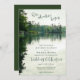 For your lakeside or riverside wedding celebration, this rustic "Our adventure begins" wedding invitation card, created from my own personal kayaking photograph and with a subtle digital watercolor effect and typographic elements, features a beautiful nature scene under an overcast sky with lightly rippled but calm water reflecting distant evergreens, cedar trees and rock structures - by katz_d_zynes