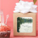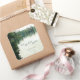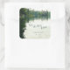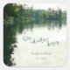 For your lakeside or riverside wedding celebration, this rustic "Our adventure begins" wedding invitation sticker, created from my own personal kayaking photograph and with a subtle digital watercolor effect and typographic elements, features a beautiful nature scene under an overcast sky with lightly rippled but calm water reflecting distant evergreens, cedar trees and rock structures - by katz_d_zynes