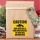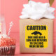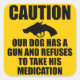 A silhouette of a handgun and the phrase "Caution, our dog has a gun and refuses to take his medication"