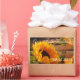 A beautiful and traditional country design with a golden fall harvest theme including a sunflower, fall leaves and foliage, orange butterfly and rustic wood background. In wonderful, fall and autumnal deep golden hues with orange, green and brown.