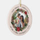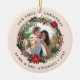 Elegant and modern personalized First Christmas ceramic ornament with beautiful Christmas wreath. Personalize the product with the year, the family name and two of your favourite wedding photos.