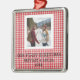 Celebrate love and new beginnings with this personalized “Our First Christmas” metal ornament. Featuring a sweet photo of a couple holding hands in a snowy winter scene, this keepsake captures the warmth of your first holiday together. Customize with your names and year to create a timeless memento or the perfect gift for newlyweds and engaged couples. Printed on durable metal with a festive red gingham background and red ribbon for easy hanging, it’s a beautiful addition to any Christmas tree.