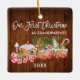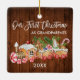 Modern Brush Script Our First Christmas as Grandparents Ornament includes Watercolor Gingerbread Train with candy, cookies and pines. Rustic Country Wood Print.
