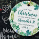 First Christmas in <add name of your street> Street in classic and simple serif and cursive script typography on a green greenery foliage botanical holiday wreath
