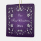 Remember your special day every Christmas with this beautiful purple ceramic ornament with simulated silver flowers and vines on the front and a pair of simulated glitter and printed on diamonds joined hearts brooch. Customizable text on front and back that you can personalize how you like. ****PLEASE NOTE that this was designed for the square ornament. If you change it to be another shape, some elements may be cut off during printing.