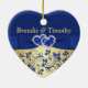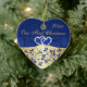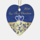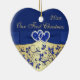This royal blue and gold floral ceramic heart shaped ornament has a PRINTED blue ribbon and bow with a pair of FAUX glitter and diamond jewel PRINTED joined hearts on it. It would make a nice keepsake of your special day, or a great gift for the newlyweds, or change the text and give them as gifts to your wedding party attendants or special people as favours. If you need help customizing this, or if you want something changed, email niteowlstudio@gmail.com.