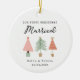 Celebrate your incredible journey with our "Our First Christmas Married" personalized ornament. This unique keepsake features a beautiful boho Scandinavian flat illustration of three distinct Christmas trees, bringing a cozy and modern touch to your holiday decor. Easily customize it with your names and your special date or the significant year to commemorate your first incredible year as a married couple. The text "Our First Christmas Married" is ready to personalize, and can also be changed to "Our First Christmas as Mr. & Mrs." This timeless custom ornament is the perfect first anniversary gift, a cherished reminder of your new life together, or a thoughtful present for any newlywed couple during the holidays.