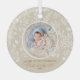 Round glass Christmas tree ornament features your favourite photo surrounded with white leaves, berries and dots on an ivory background. TIP: Upload a high resolution photo that features you in the middle - you can crop to a square, too. Ornaments make memorable gifts for family and friends or create for yourself. MORE colours and DESIGNS in our store.