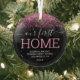New home glass christmas ornament featuring a trendy black background, a elegant pink glitter waterfall design, the cute saying 'our first home', your name(s), your new address, and the year.