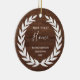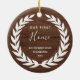 This simple and rustic Christmas ornament features a classic white laurel wreath on a brown wood look background, and says "our first home" in trendy handwritten script, with room for you to add your address. The perfect housewarming gift or holiday remembrance for the new homeowner.