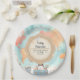 A cute co-ed baby shower invitation companion paper plate, with a travel and adventure theme, featuring a scalloped frame with cute characters and travel related elements, with the title Baby Adventure Club. Perfect for future parents who love to travel, who love the adventure theme for a baby shower.