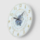 Blue rose wall clock on a light blue damask background. Gold coloured floral trim. Calligraphy reads: " Oh, Most Beautiful Flower of Mount Carmel, fruitful vine, the splendour of heaven".