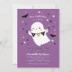 Celebrate your little one's first birthday with this adorable Halloween-themed birthday party invitation. It features a purple, black, white, and orange theme with an illustration of a cute smiling ghost holding a bunting banner with word "One"