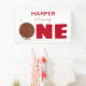 An Our little meatball is turning one first baby birthday banner. This banner is white, red, and brown with the word "One" in large letters with a cute meatball illustration as the first letter of the word. Simply customize this banner, add it to your cart, and happy birthday to your wonderful baby!