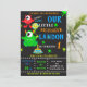 This cute pastel colours lil monster invitation featuring cute green monster with a balloon, red one eyed monster, small cake with one candle and some coloured blots around.