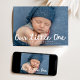 Celebrate your newest arrival with this sweet and modern “Our Little One” photo birth announcement card. The front features your baby’s horizontal photo with “Our Little One” displayed in a handwritten white script, paired with your baby’s name, birth date, and stats below. The back of the card includes a vertical photo and a customizable thank you message, allowing you to express gratitude to loved ones while sharing another special moment. Perfect for baby boys, girls, or gender-neutral announcements, this photo-forward design makes a heartfelt keepsake for friends and family.