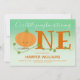 Our little pumpkin is turning one first baby birthday invitation. This invitation is green, white, and orange with the word "One" in large letters and a cute, smiling pumpkin cartoon as the first letter of the word and a green vine growing along the word. Customize this invitation, add it to your cart, and happy birthday to your awesome baby!