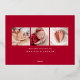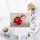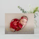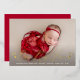 Elegant foil birth announcement featuring "Our New Love" displayed in a gold foil script overlay with rose gold foil hearts on each side. Personalize the gold foil birth announcement with a horizontal newborn photo, the baby's name, and birth stats. The announcement reverses to display 3 additional photos and text with a solid dark red background. The 4 photo birth announcement is perfect to use as a Valentine's day birth announcement!