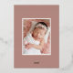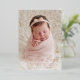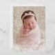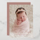 Elegant foil birth announcement featuring "Our New Love" displayed in a rose gold foil script overlay with rose gold foil hearts on each side. Personalize the rose foil birth announcement with a vertical newborn photo, the baby's name, birth stats, and welcomed by text. The announcement reverses to display an additional photo with a solid dark mauve background. The 2 photo birth announcement is perfect to use as a Valentine's day birth announcement!