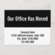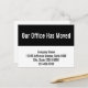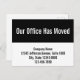 Front: "Our Office Has Moved" is in large, white text at the top. Four lines of black display text are at the bottom. You can edit the text to show your company name, address, and phone number.
