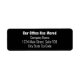 These black moving announcement labels have a text template you can edit to show a custom message. There are four lines of white display text that you can edit. As shown, the top line reads Our Office Has Moved. The font on the top line has a bold typeface. The second line is for the business name. The third line is for the street address. The final line is for the city, state, and zip code.